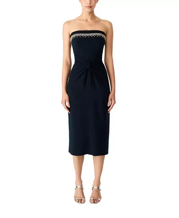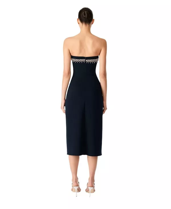 Бренд: Jenny Packham Цвет: синий Элегантное и современное, это черное платье без бретелей - образец изысканности вечернего наряда. Скроенный лиф точно повторяет контуры тела, визуально удлиняя силуэт и позволяя ткани изящно струиться. Нежная кристальная отделка подчеркивает вырез, придавая ему легкое мерцание. Идеальный выбор для вечера сдержанного гламура.