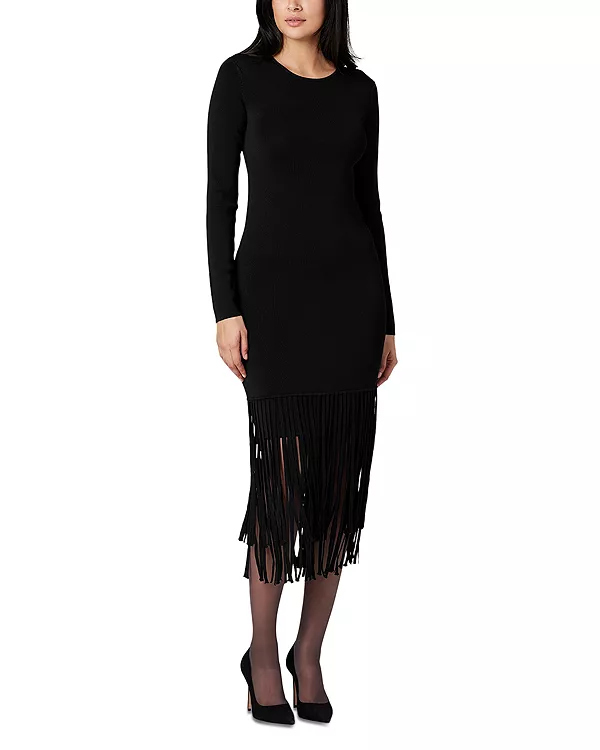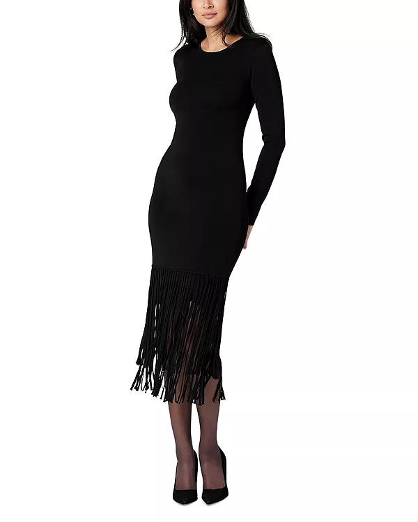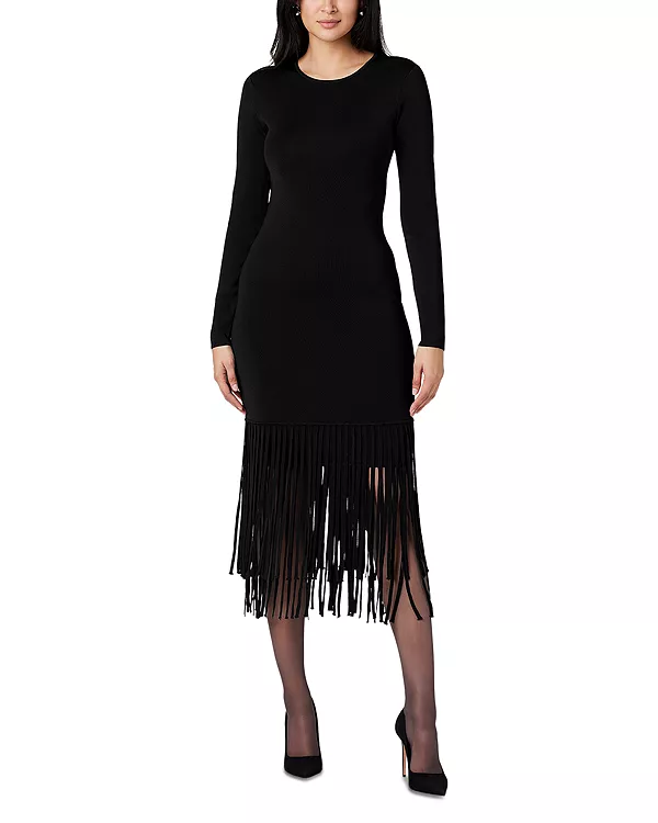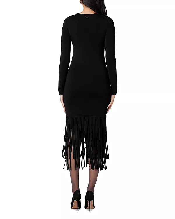 Платье TOCCIN Darby Fringe Dress отличается облегающим силуэтом, длинными рукавами и эффектной бахромой по низу - это стильный образ для осенних вечеров.