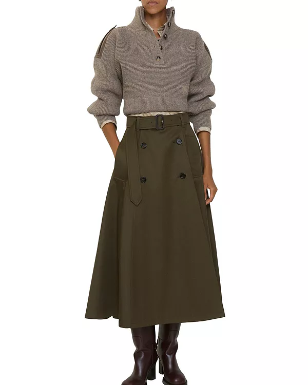 Переосмысление нашей фирменной дождевой одежды: расклешенная юбка-миди в стиле тренч из водоотталкивающего хлопкового габардина. Ткань соткана на фабрике Burberry в Йоркшире. Высокая посадка на талии, А-образный силуэт, съемный пояс с пряжкой B для регулировки посадки.
