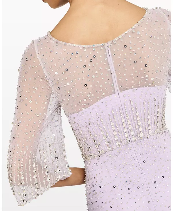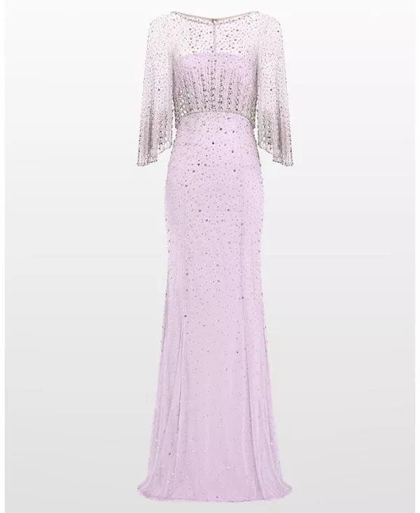Это платье сочетает в себе полупрозрачные слои с элегантной структурой, создавая изысканный образ с ноткой дерзости. Силуэт лаконичный и минималистичный, контрастирует с украшенной отделкой, переходящей в рукава три четверти. Кристаллы, нанесенные вручную, ниспадают от выреза и собираются на талии, а затем рассеиваются по юбке, создавая объем, текстуру и движение. Современный вечерний образ с умеренным блеском.