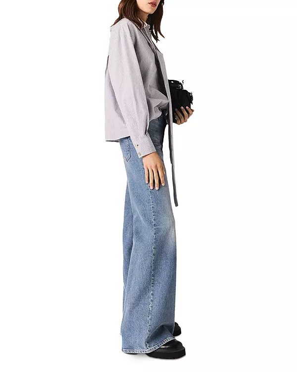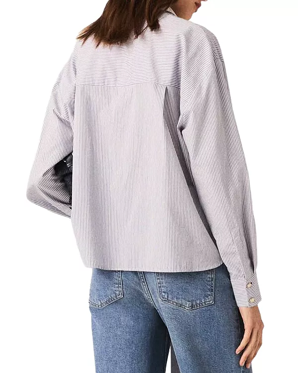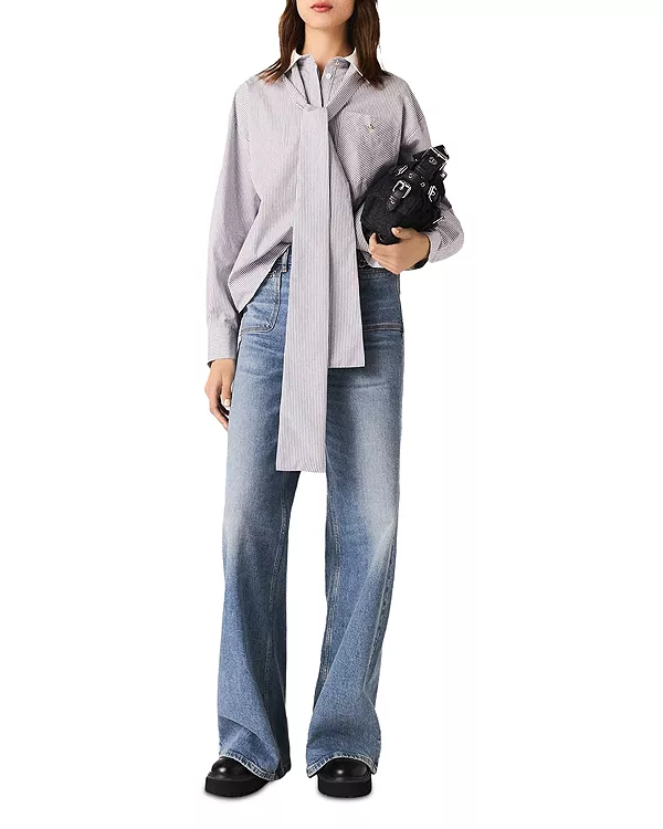 Maje стильно переосмысливает базовые элементы гардероба, играя с объемами и тканями. Вдохновленная стилем преппи, эта рубашка со съемным контрастным воротником украшена бантом, который можно завязать или носить свободно, и тонким полосатым принтом.