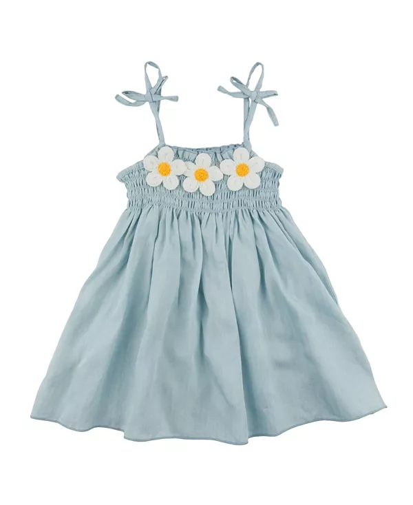 Детское джинсовое платье-игрушка с вязаными крючком ромашками. Oh Baby!, синий