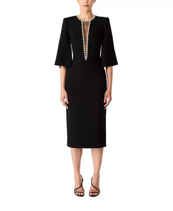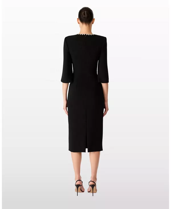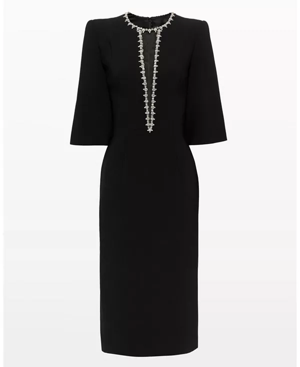 Бренд: Jenny Packham Цвет: черный Безупречно скроенное, это скульптурное платье облегает тело с непринужденной грацией, а точно выверенные рукава добавляют нотку архитектурной драматичности. Потрясающе смелый глубокий вырез украшен каскадом кристальных элементов. Благодаря своему утонченному, но эффектному виду, это платье создано для моментов, требующих уверенности и изящества. Плавные линии ткани в сочетании с игрой чистых линий и нежного мерцания делают его безупречным выбором для случаев, требующих изысканной, но сдержанной элегантности.