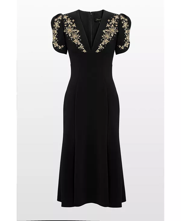 Бренд: Jenny Packham Цвет: черный Изысканное коктейльное платье, излучающее вневременную элегантность, украшенное замысловатой вышивкой и декоративными элементами вдоль плеч и выреза горловины. Структурированный силуэт и глубокий V-образный вырез добавляют изысканности, а гладкая ткань подчеркивает его утонченный вид. Идеально подходит для торжественных дневных мероприятий и коктейльных вечеринок, сочетая классический шарм с современной утонченностью.