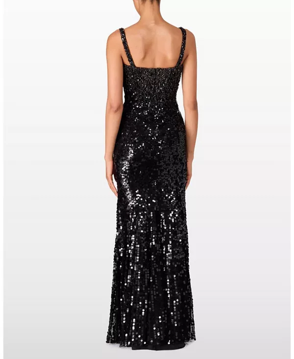 Это платье, обрамленное изящными бретелями и квадратным вырезом, полностью украшено сверкающей вышивкой, создающей эффектный завершающий штрих. Силуэт облегающий в области лифа и плавно расширяющийся к подолу, создавая сбалансированную и элегантную форму. Блеск тонко меняет оттенок сверху вниз, добавляя динамичности. Идеально подходит для торжественных случаев, вечерних приемов или выходов на красную дорожку.