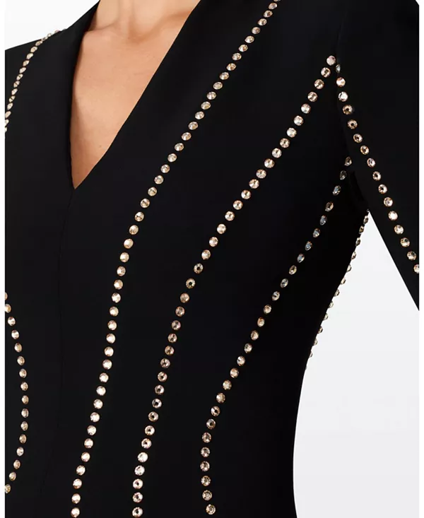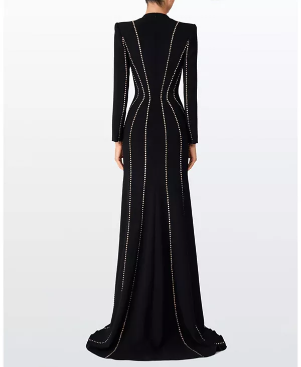 Бренд: Jenny Packham Цвет: черный Это платье отличается четким V-образным вырезом и длинными рукавами с вертикальными декоративными линиями, которые подчеркивают и удлиняют силуэт. Дизайн создает скульптурный эффект, сохраняя при этом чистую, минималистичную эстетику. Мягкий расклешенный подол добавляет движения, не нарушая структурированность силуэта. Уверенный выбор для торжественных вечерних мероприятий или выходов на красную дорожку.