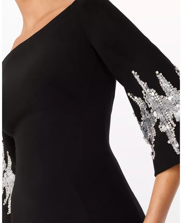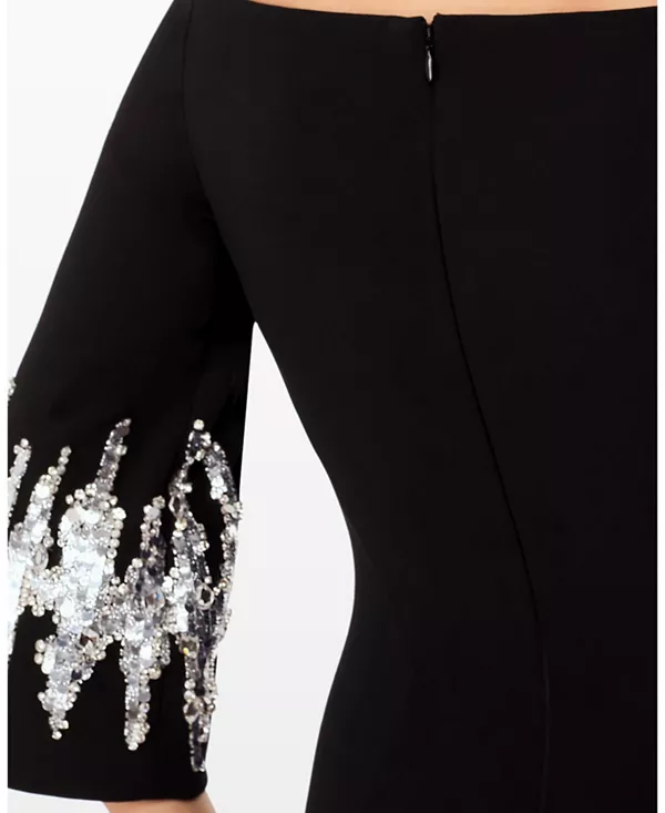 Бренд: Jenny Packham Цвет: черный Это изысканное коктейльное платье сочетает в себе структурированность и блеск с непринужденной легкостью. Модель с фигурным вырезом на плечах и приталенным силуэтом дополнена замысловатой отделкой на рукавах, которая придает ей тонкий, современный оттенок. Идеально подходит для открытия выставок, зимних свадеб или торжественных ужинов, предлагая утонченный и в то же время неповторимый вечерний вариант.