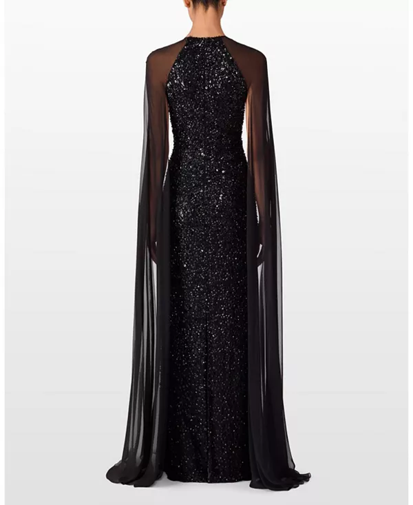 Изысканное вечернее платье, излучающее небесное очарование, украшено замысловатой вышивкой, которая переливается на его струящемся силуэте. Детальная вышивка бисером и легкое мерцание создают ощущение утонченности, а грациозная драпировка обеспечивает легкость движений. Идеально подходящее для торжественных мероприятий, оно воплощает вневременную элегантность с современным шармом.