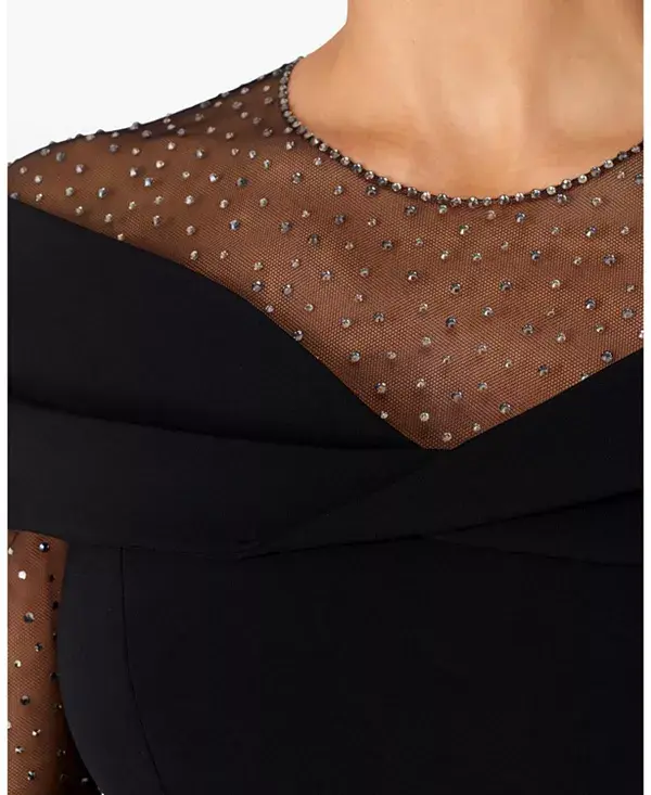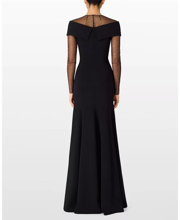 Это платье отличается структурированным вырезом на плечах и прозрачными рукавами с отделкой, создавая современный, но в то же время классический образ. Приталенный лиф и расклешенная юбка создают четкий, привлекательный силуэт. Небольшие детали на рукавах и вырезе добавляют образу изысканности. Подходит для торжественных ужинов, приемов или мероприятий на красной дорожке.