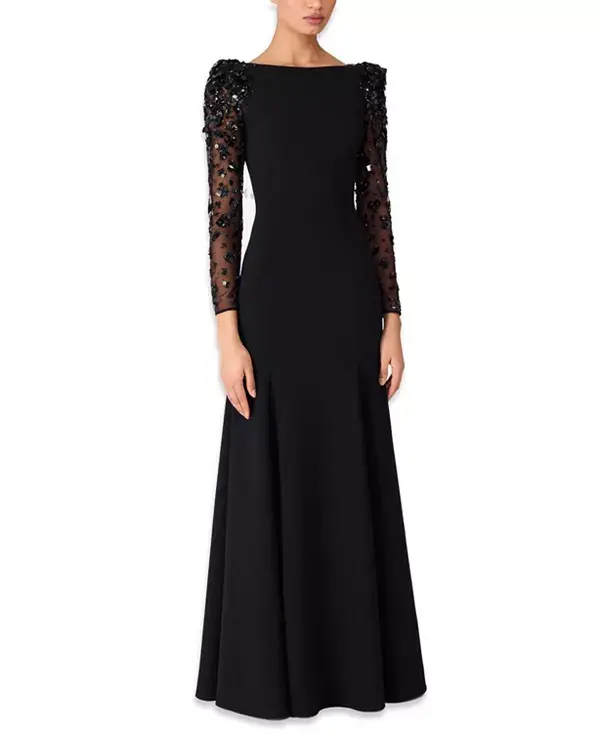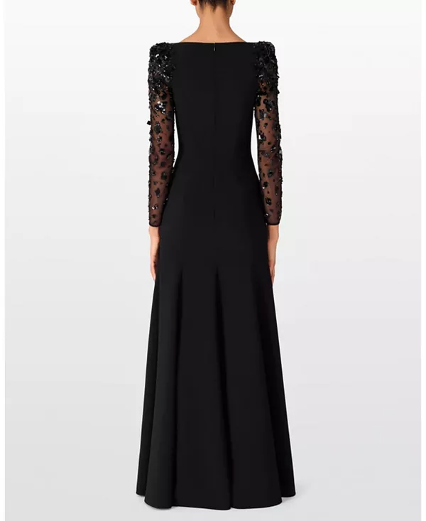 Это платье, отличающееся лаконичным вырезом-лодочкой и пышной юбкой, дополнено прозрачными рукавами, украшенными цветочной вышивкой в тон. Приталенный лиф переходит в мягкий А-образный силуэт, обеспечивая одновременно структуру и свободу движений. Вышивка на рукавах добавляет изысканности и современности. Идеальный выбор для гала-вечеров, приемов или вечерних мероприятий.