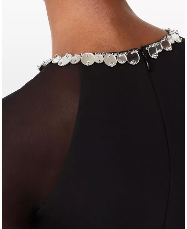 Бренд: Jenny Packham Цвет: черный Элегантное и изысканное, это платье сочетает в себе гладкий силуэт и нежную отделку, создавая утонченный образ. Прозрачные рукава украшены мерцающими деталями, сужающимися к запястью, а мягкая отделка на вырезе добавляет тонкий акцент. Дизайн идеально подходит для коктейльных приемов, торжественных ужинов или вечерних мероприятий, добавляя гламура.