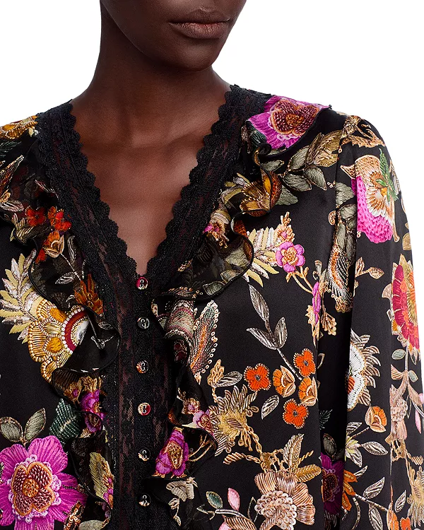 Оборки и полупрозрачная кружевная отделка по краю горловины и планки