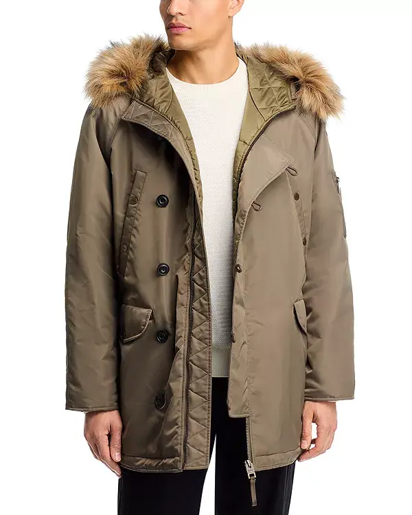 Два верхних прорезных кармана, два нижних передних накладных кармана с потайными кнопками, карман на молнии на левом рукаве