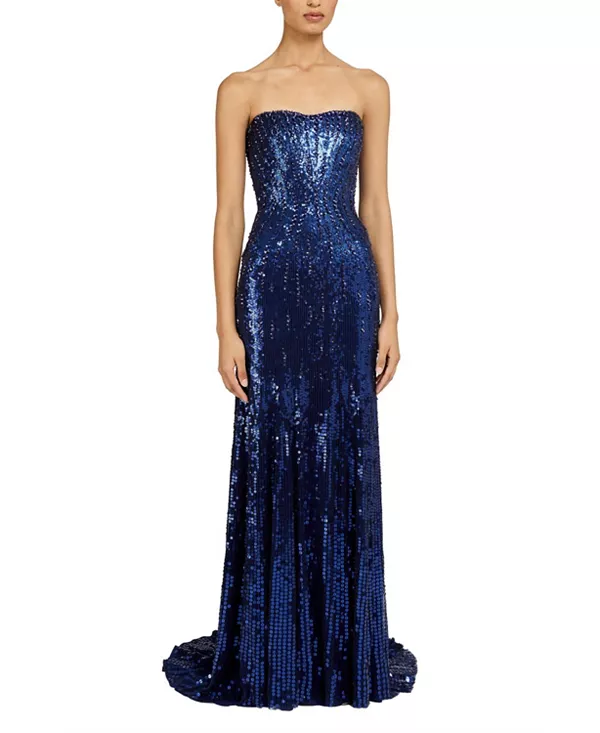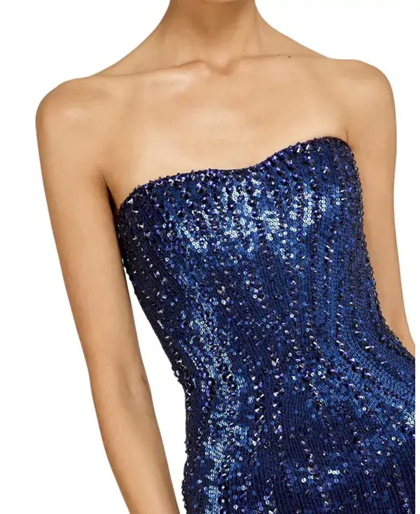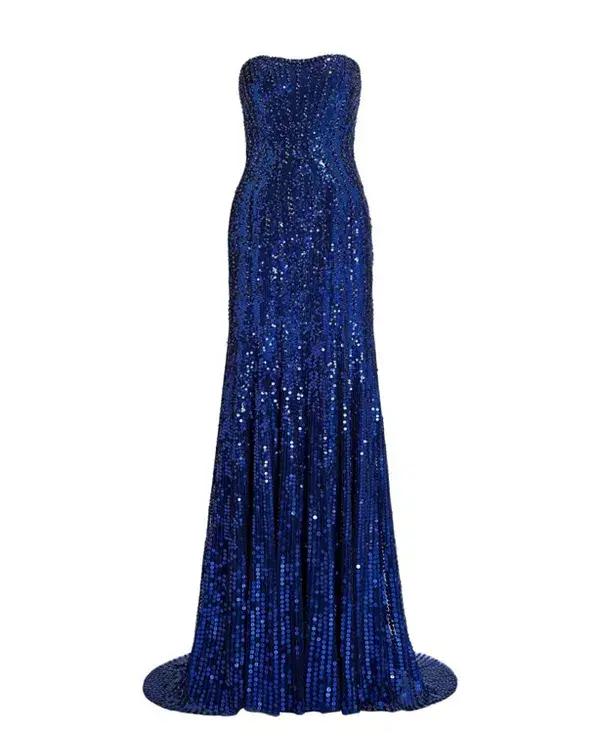 Привлеките всеобщее внимание в этом потрясающем платье без бретелей - сверкающем шедевре гламура и изысканности. Украшенное замысловатыми пайетками, ниспадающими от облегающего лифа до подола в пол, это платье создает сияющий, переливающийся на свету эффект. Обтекаемый силуэт прекрасно подчеркивает фигуру, а декольте без бретелей добавляет нотку вневременного очарования и современной элегантности.