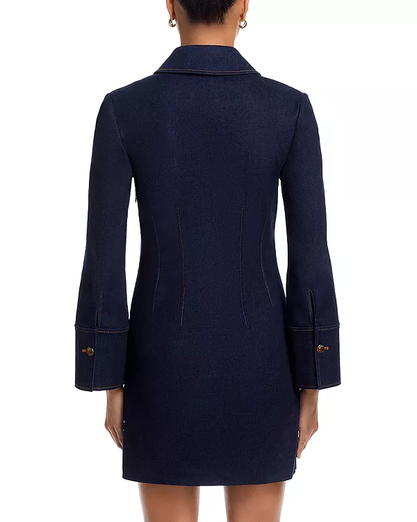 Бренд: Veronica Beard Цвет: синий Изысканная интерпретация джинсового платья. Сшитое из фирменной эластичной джинсовой ткани Veronica Beard темно-синего цвета, платье Raymond имеет лестный силуэт «приталенный верх и расклешенная юбка», подчеркнутый угловыми швами на лифе, выделяющими талию. Воротник с разрезом, планка без пуговиц и слегка расклешенные длинные рукава придают платью элегантный вид.