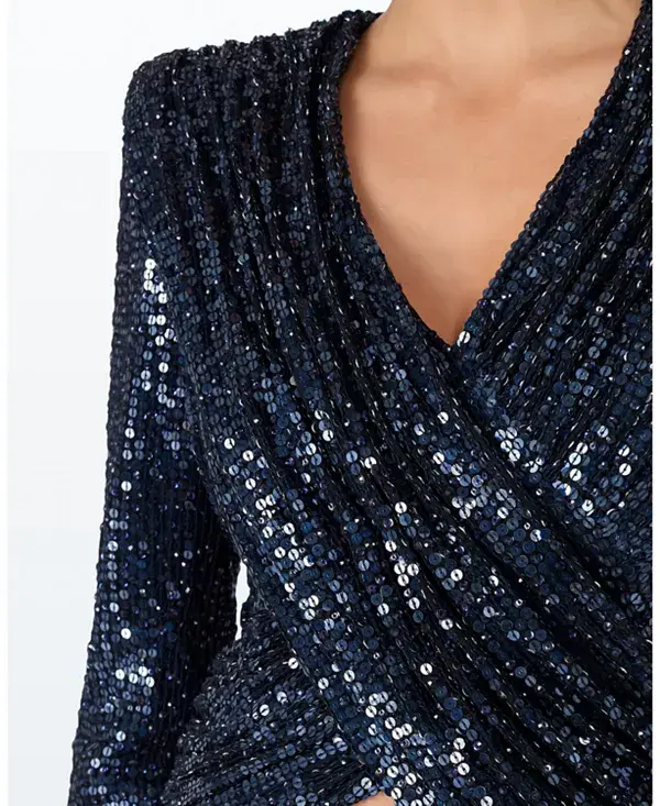 Особенности: V-образный вырез Потайная застежка-молния сзади Длинные рукава На подкладке Топ с драпировкой и пайетками, облегающий в области груди и талии, тканый материал Импортный товар