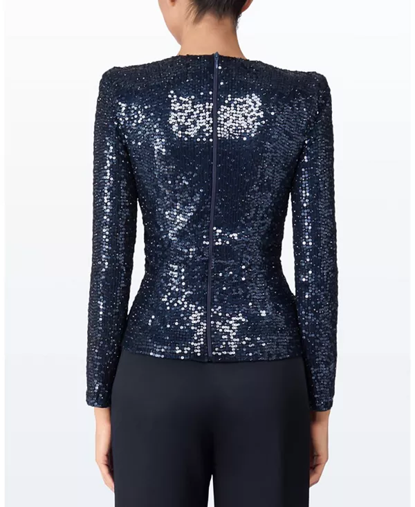 Бренд: Jenny Packham Цвет: синий Этот топ с длинными рукавами украшен вышивкой по всей поверхности, имеет облегающий запах спереди и мягко присборенную талию. V-образный вырез и структурированные плечи подчеркивают фигуру, сохраняя при этом строгий и элегантный силуэт. Благодаря приталенному крою его легко сочетать с брюками или юбками для вечерних образов. Идеально подходит для коктейльных вечеринок, праздничных ужинов или торжественных мероприятий.