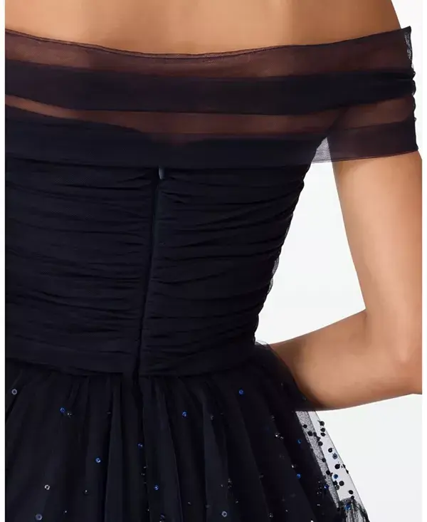 Это платье с открытыми плечами и структурированным лифом украшено многослойными прозрачными ярусами, которые добавляют объем и мягкость движению. Нежные блестки, разбросанные по юбке, придают ей изысканный, но в то же время привлекательный вид. Длина до пола и плиссированные детали усиливают его драматичный, романтический шарм. Элегантный вариант для официальных гала-вечеров, вечерних балов или мероприятий на красной дорожке.