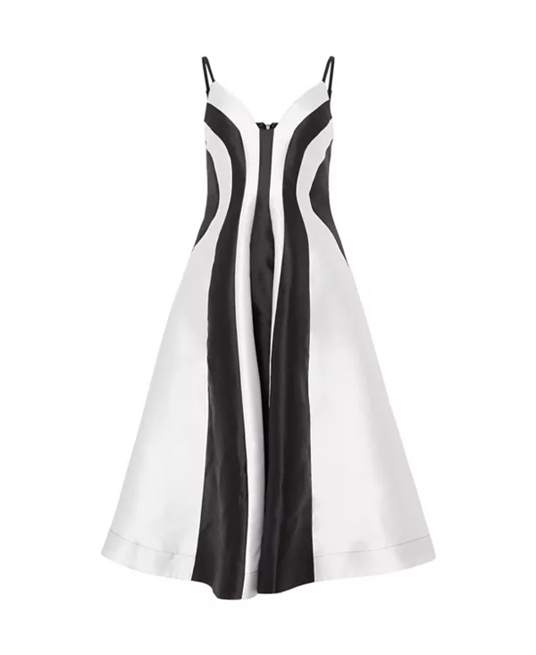 Приталенный крой в области груди и талии, свободный в области бедер; длина подола - до середины икры.