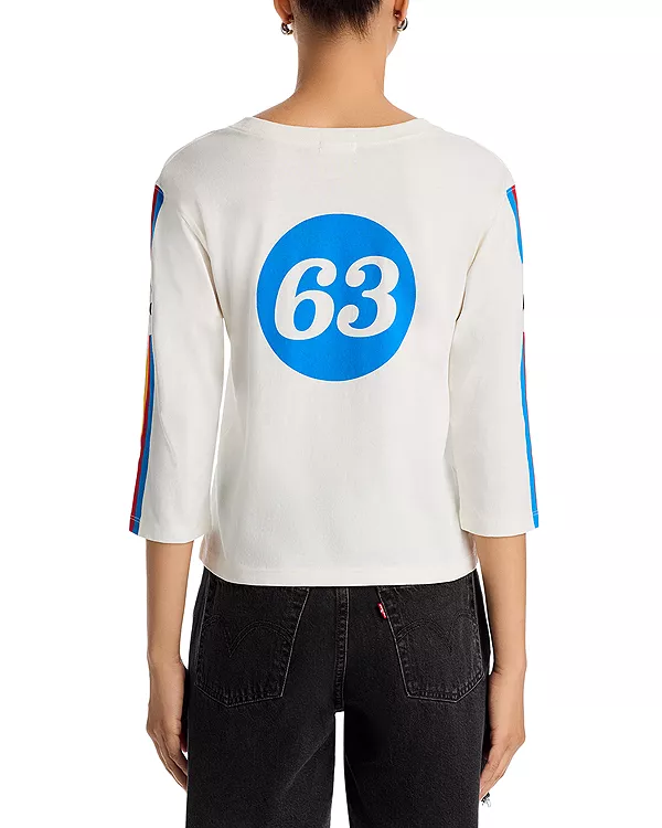 Логотип и полосатый принт спереди, цифра "63" и полосатый принт на рукавах