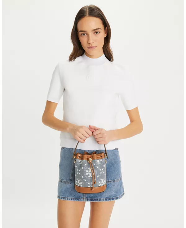 Мини-сумка-ведро T Monogram выполнена из выстиранного джинсового жаккарда с фирменным узором бренда. Она закрывается на шнурок, фиксируемый золотистым стопором Double T, и каждая деталь продумана с особым вниманием к функциональности и универсальности. При ношении через плечо верхняя ручка естественно опускается.