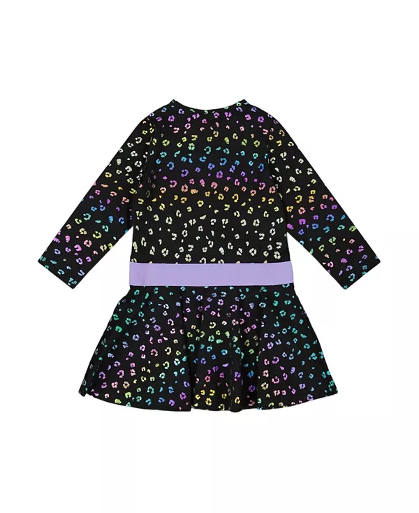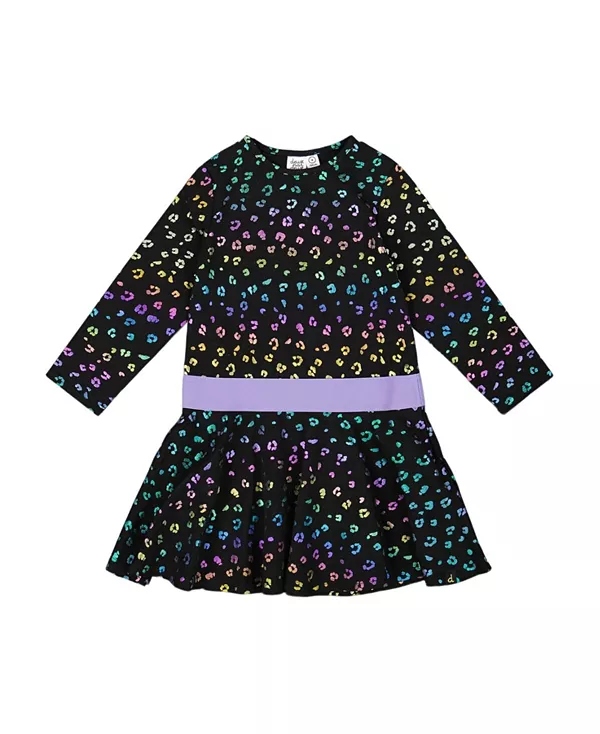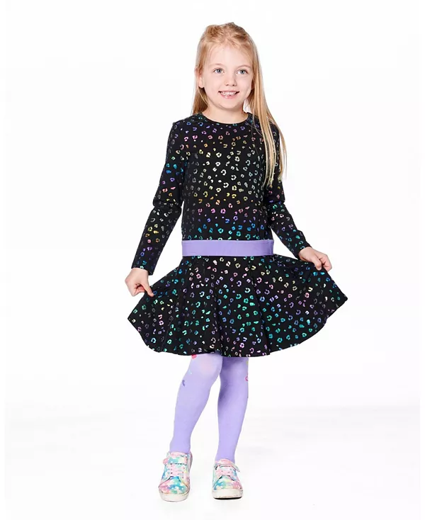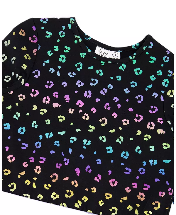 Бренд: Deux Par Deux Цвет: черный Наше трикотажное платье с разноцветным леопардовым принтом добавит игривости любому гардеробу. Изготовленное из мягкого эластичного хлопка, это расклешенное платье с длинными рукавами реглан имеет круглый вырез, радужный леопардовый принт и контрастный лавандовый пояс, который добавляет игривости. Идеально подходит для школьных дней, игр с друзьями или просто для прогулок по гостиной.