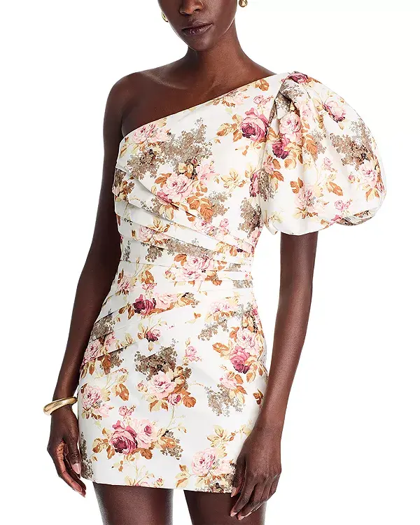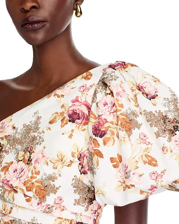 Цветочный принт по всей поверхности, асимметричные складки на лифе