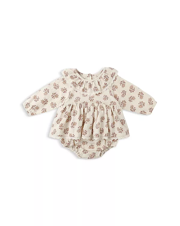 Комбинезон Thalia от Quincy Ma отличается милым воротничком, изящной кружевной отделкой, присборенной талией, кокосовыми пуговицами на спине и застежками-кнопками снизу для удобства переодевания.