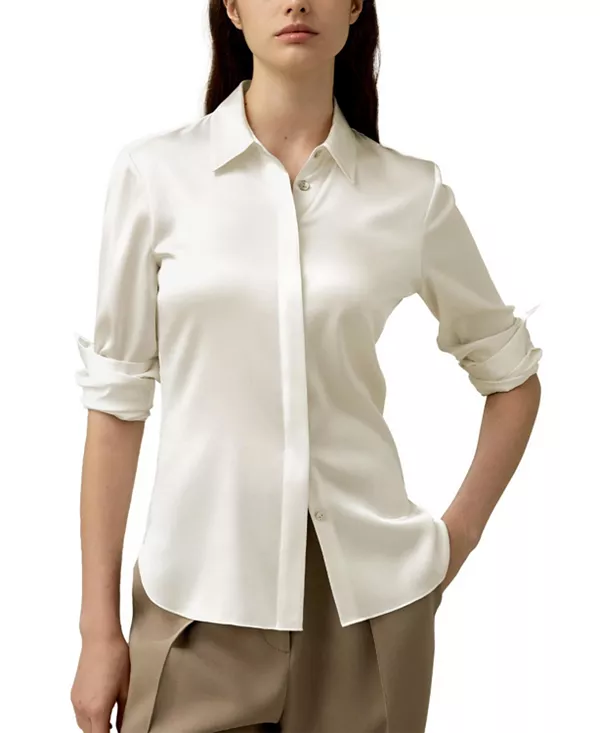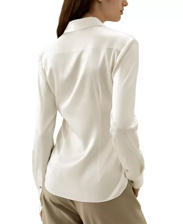 Бренд: Lilysilk Цвет: белый Эта шелковая рубашка имеет приталенный силуэт на спине, создающий более аккуратный и элегантный визуальный образ. Изготовленная из эластичной шелковой ткани, она уравновешивает стесняющий движения силуэт с комфортом и гибкостью. Скрытая планка и пуговицы добавляют рубашке нотку минимализма и универсальности. Стратегически расположенная кокетка на спине подчеркивает изящную линию плеч, добавляя нотку силы благодаря своей мужественной структуре. Эта рубашка - идеальное сочетание изысканности и комфорта, подходящее как для работы, так и для повседневной носки.