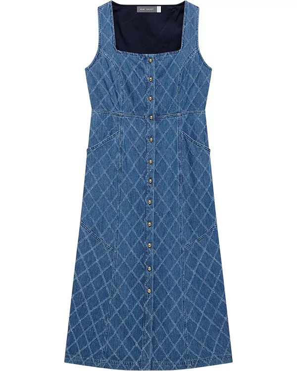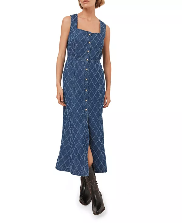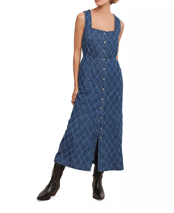Джинсовое платье без рукавов цвета индиго, миди-силуэта, с квадратным вырезом, ромбовидной текстурой, боковыми карманами, А-образным силуэтом и застежкой на золотые пуговицы спереди.