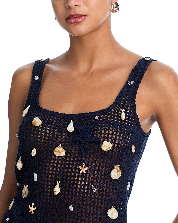 Украшение спереди в виде настоящих ракушек и детали в виде морских звезд, связанных крючком