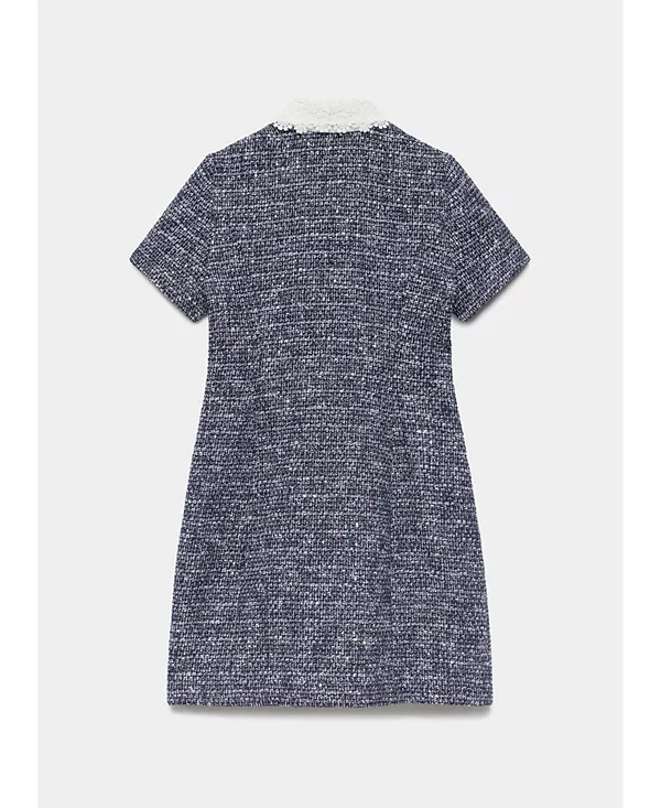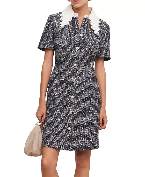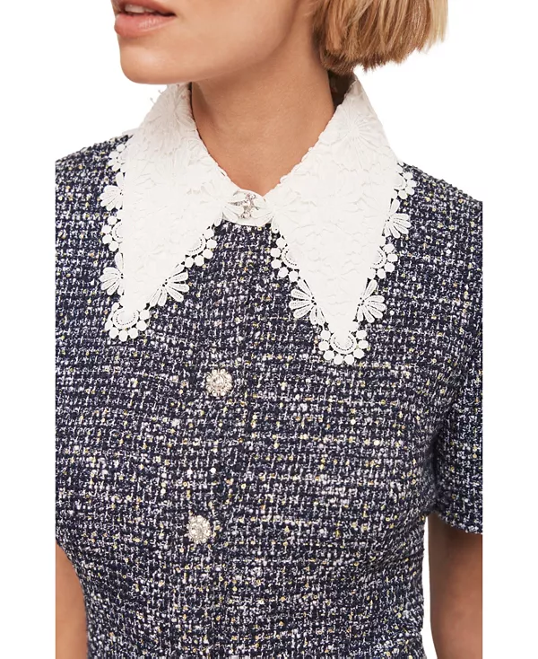 Платье из букле темно-синего цвета, мини-силуэта, с эффектным кружевным воротником, короткими рукавами и изящной застежкой на пуговицы спереди.