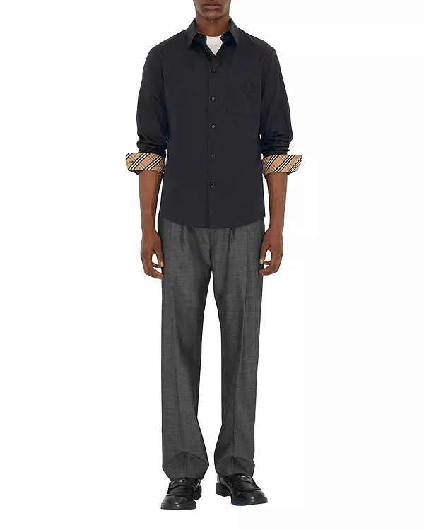 Бренд: Burberry Цвет: синий Рубашка из итальянского хлопкового поплина, прямого кроя. Модель украшена вышивкой в виде рыцарского узора в тон ткани - архивного мотива, впервые появившегося на сумках Burberry в 1980-х годах. Подверните манжеты, чтобы увидеть подкладку в клетку Burberry.