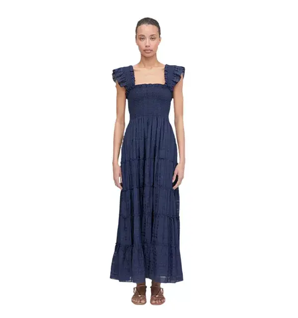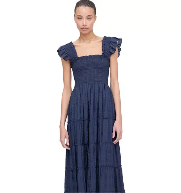 Платье Ellie - это платье А-силуэта с нашей фирменной эластичной сборкой, рюшами на плечах, многослойной юбкой миди и карманами.