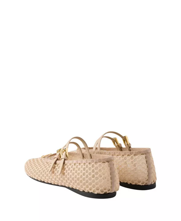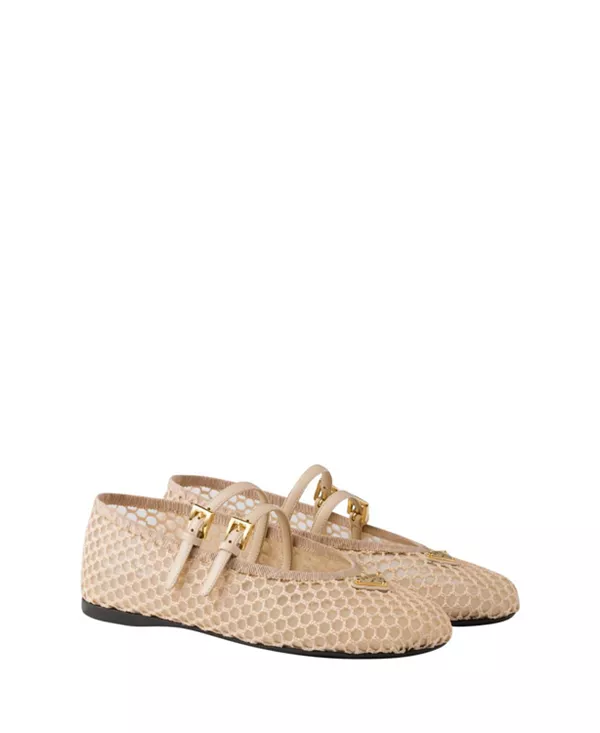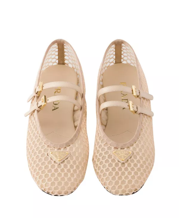 Бренд: Prada Цвет: бежевый Эти сетчатые балетки Prada, сочетающие в себе вневременную классику и современность, переосмысливают классику благодаря двойному ремешку, изящному логотипу и сетке в стиле макраме.