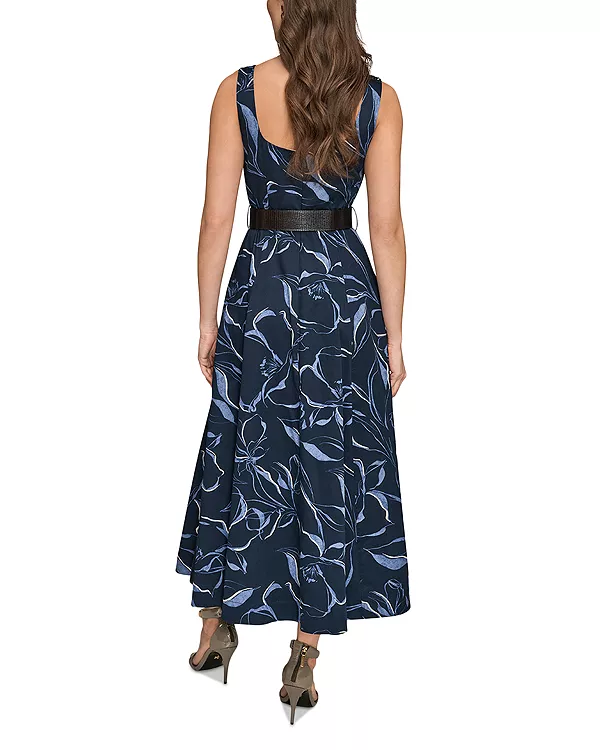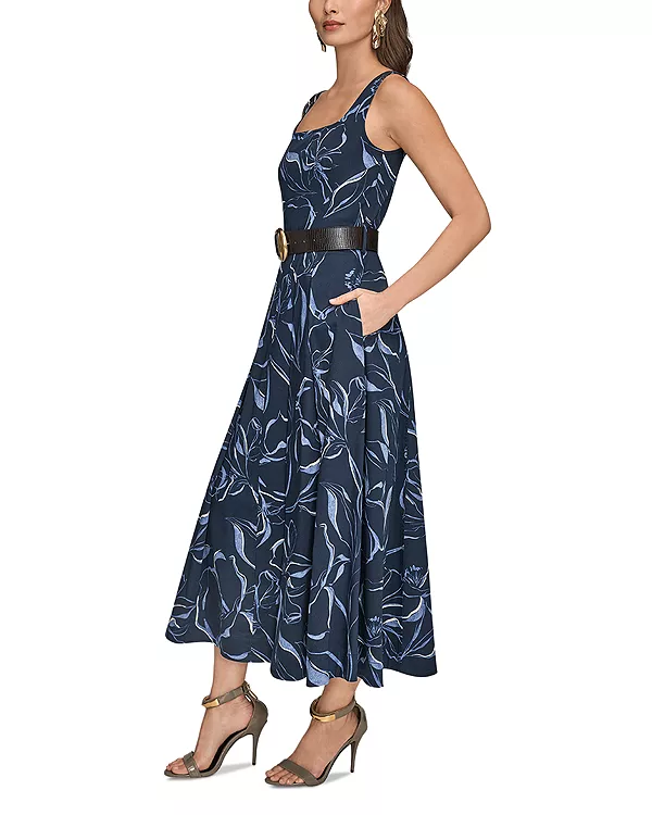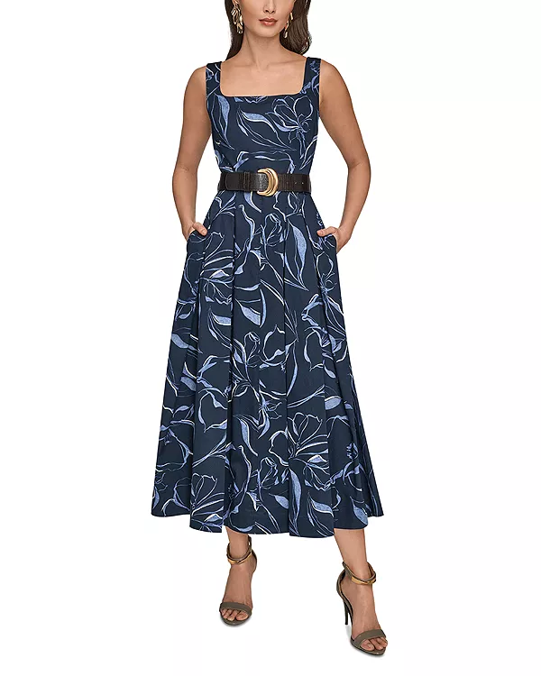 Платье с квадратным вырезом и поясом Donna Karan, синий