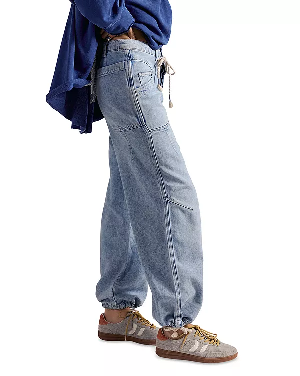 Эти джинсы от Free People, идеально подходящие для повседневной носки, имеют свободный крой, надеваются через голову, а пояс и манжеты на шнурке позволяют регулировать посадку по фигуре.