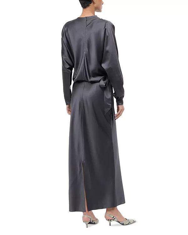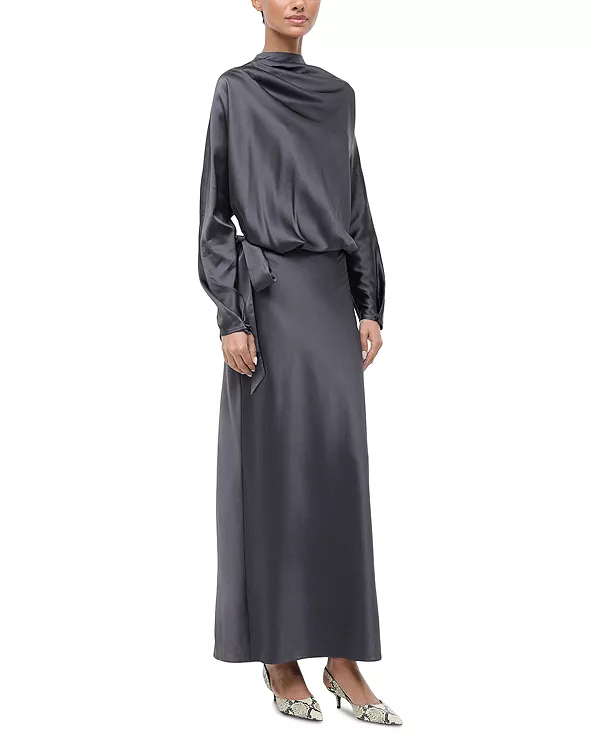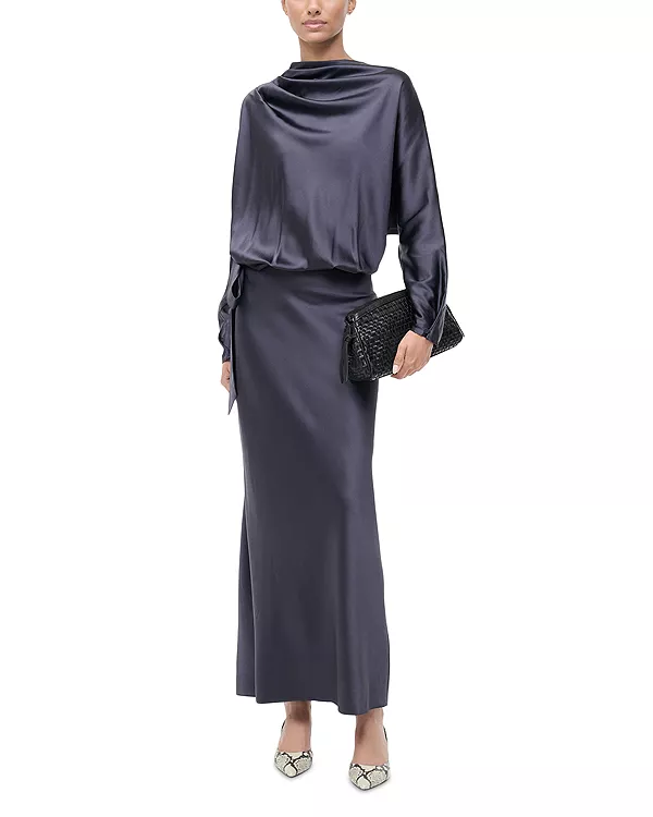 Платье Phoebe от STAUD сшито из эластичной шелковой атласной ткани, имеет завязку сбоку на талии и юбку-футляр макси-длины.