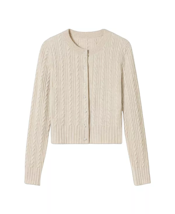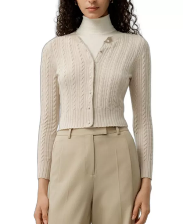 Бренд: Lilysilk Цвет: бежевый Эксклюзивность сочетается с нежностью - этот кардиган соткан из редчайшего в мире детского кашемира, волокна, известного своей невероятной мягкостью и теплотой. Каждая деталь, от скульптурной вязки косами до сияющих жемчужных пуговиц, тщательно продумана, чтобы подчеркнуть достоинства фигуры и придать ей изысканность. Укороченный до талии, он создает силуэт, одновременно современный и вневременной. Наденьте его и ощутите тихую роскошь, которая выглядит и ощущается так же индивидуально, как и ощущается на ощупь.