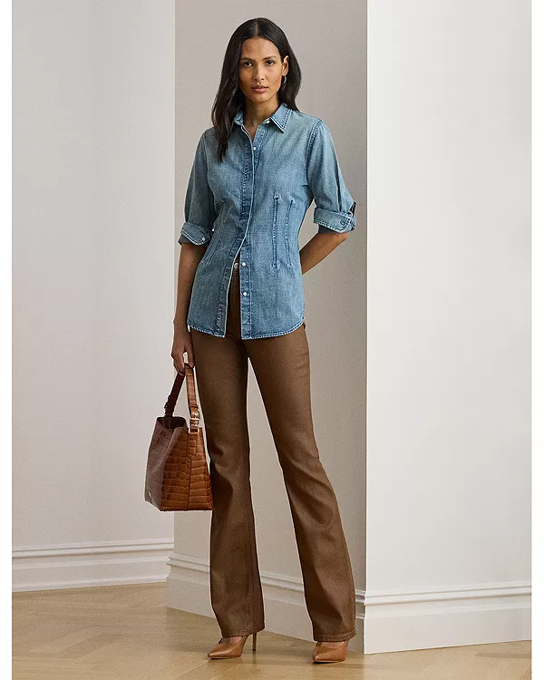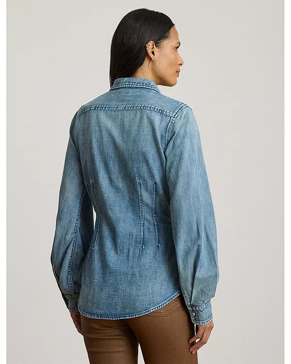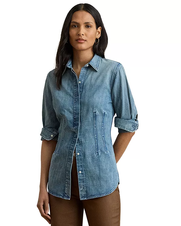 Эта рубашка с воротником, сшитая из джинсовой ткани саржевого переплетения, отделана специально расположенными вытачками спереди и сзади, что придает ей современный вид.