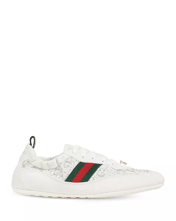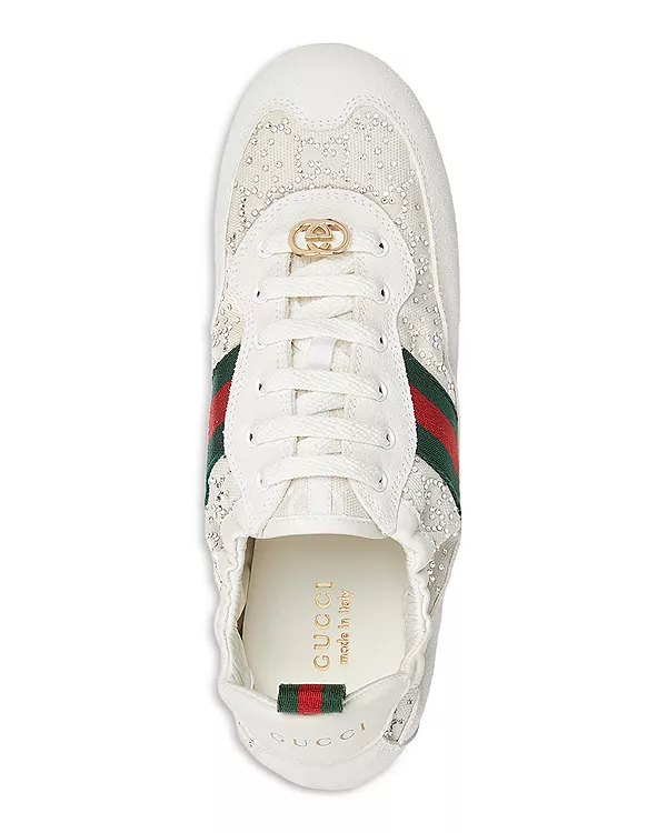 Бренд: Gucci Цвет: белый Представляем кроссовки Gucci Shift - сверхлегкую модель, которая переосмысливает спортивные элементы для другого темпа жизни. Создавая ощущение изысканного движения, их обтекаемый силуэт дополнен фирменной полосой Web и эластичной вставкой сзади, которую можно носить как с надетой, так и с отстегнутой пяткой, что обеспечивает универсальность и удобство в повседневной носке. Украшенные кристаллами GG, эти кроссовки сочетают в себе легкость и блеск, отдавая дань уважения Дому Gucci.