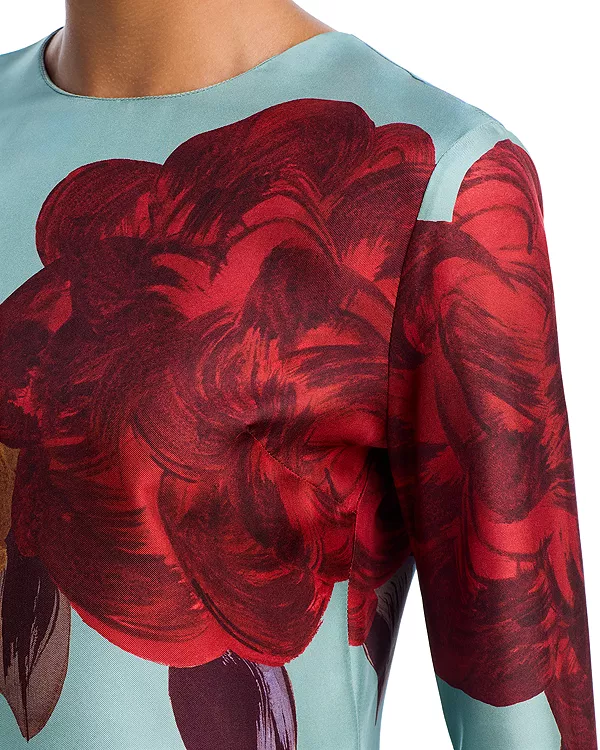 Это короткое, но элегантное коктейльное платье от La Double J, сшитое из шелкового твила Como с глянцевым блеском и фактурной отделкой, украшено вручную нанесенным принтом в виде пионов и имеет длинные расклешенные рукава.