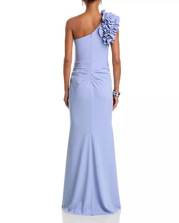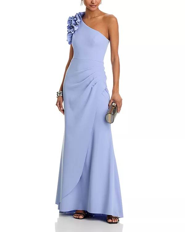 Особенности: Асимметричный вырез Силуэт без рукавов, на одно плечо Встроенные чашечки Оборка на правом плече Плиссированная передняя часть слева и сзади на талии Юбка А-силуэта с имитацией запаха Асимметричный подол Потайная застежка-молния сзади На подкладке Эксклюзивно от Bloomingdale's Сделано в США из импортных материалов