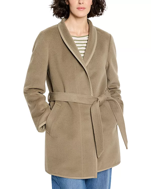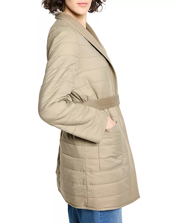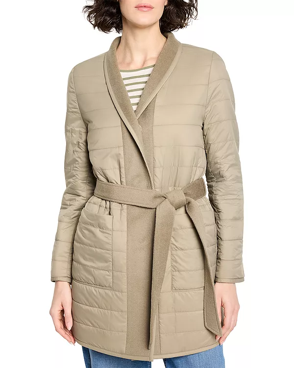 Особенности: Воротник-шаль Длинные рукава Застежка на кнопки спереди С одной стороны стеганая, с другой - шерстяная ткань Завязка на талии Прорезные карманы со стороны шерстяной ткани, накладные карманы со стеганой стороны Стеганая сторона ветрозащитная, водоотталкивающая и дышащая На подкладке Импортный товар
