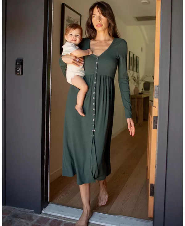 Бренд: Hatch Collection Цвет: зеленый Все дело в названии. Этот бестселлер для беременных и послеродового периода выполнен из невероятно мягкой ребристой трикотажной ткани, которая одновременно уютна и дышит (привет, ночная потливость!), а также имеет удобную застежку на кнопках для кормления грудью на ходу. Она классическая, функциональная и (что особенно важно в послеродовой период) пригодна для машинной стирки.
