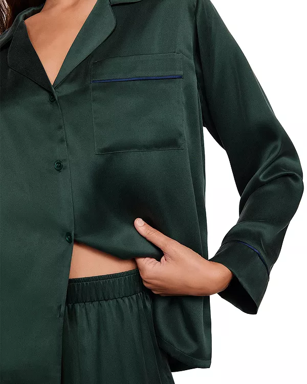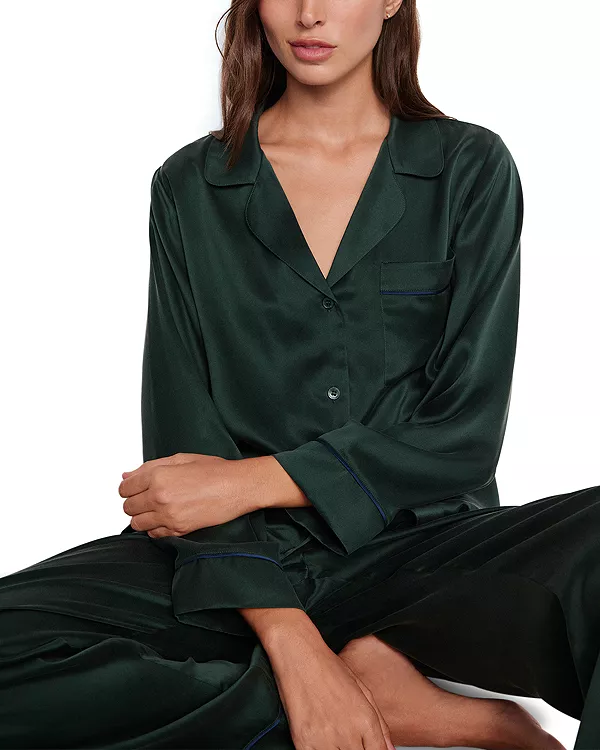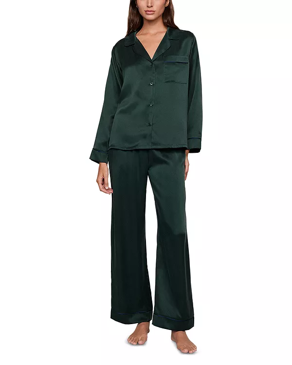 Пижама Inez от Eberjey, изготовленная из 100% тутового шелка, гипоаллергенна и обладает терморегулирующими свойствами, обеспечивая комфорт круглый год. Этот комплект включает в себя свободную рубашку с длинными рукавами и воротником-стойкой, а также брюки прямого кроя с высокой посадкой и эластичным поясом.