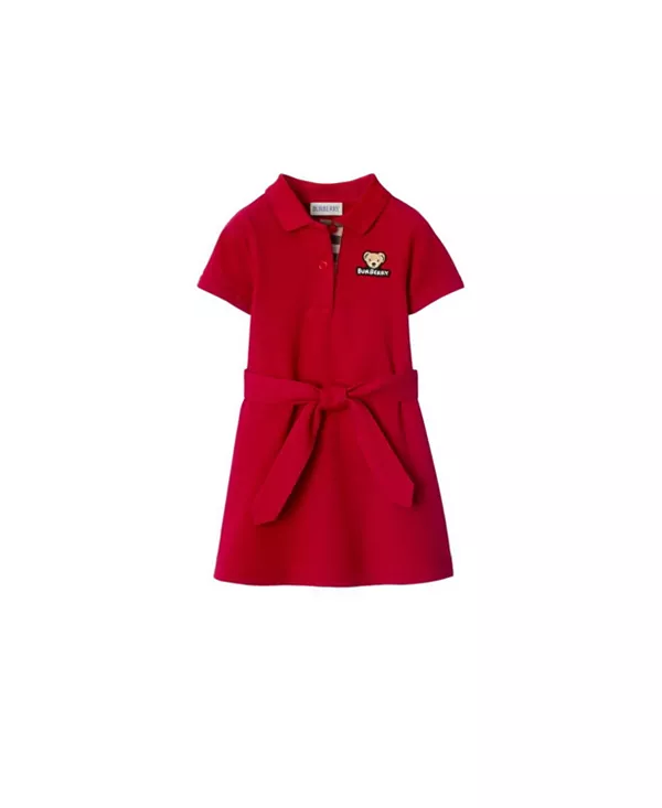 Платье-поло из хлопкового пике, украшенное аппликацией с изображением медведя Томаса и его логотипом. Модель имеет подкладку в клетку Burberry по планке и пояс на завязках.
