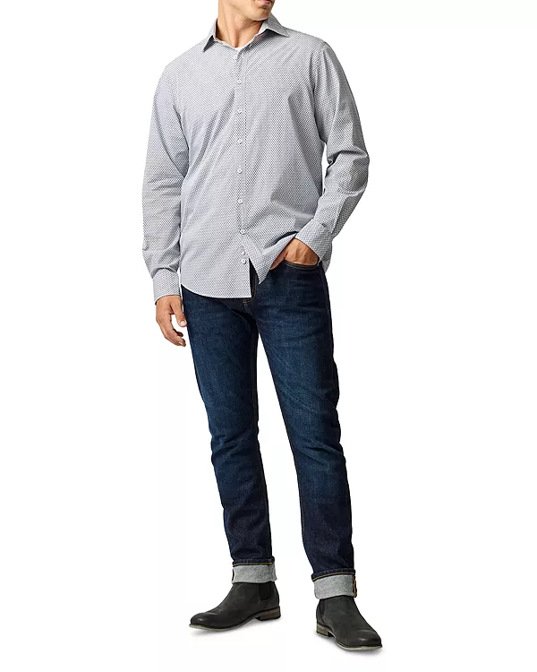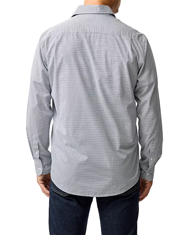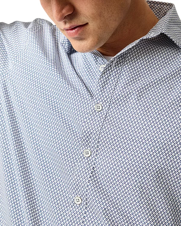 Обновите свой гардероб с помощью этой стильной рубашки с длинными рукавами, украшенной универсальным микропринтом на свежем белом фоне. Изготовлена из высококачественной европейской легкой хлопчатобумажной ткани.