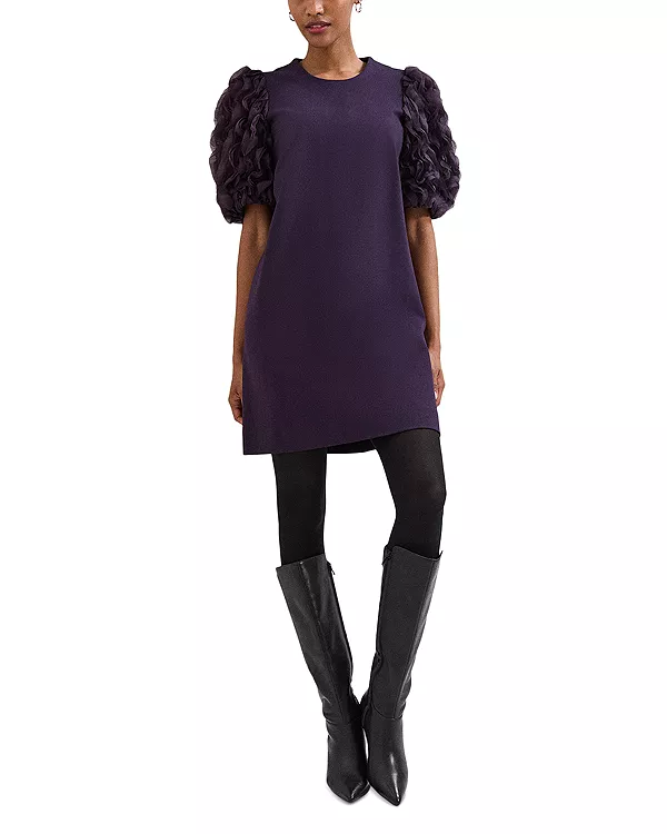 Мини-платье с оригинальной изюминкой. Модель от Phase Eight, выполненная в насыщенном оттенке, отличается эффектными объемными рукавами, украшенными великолепными оборками, что придает ей современный вид.