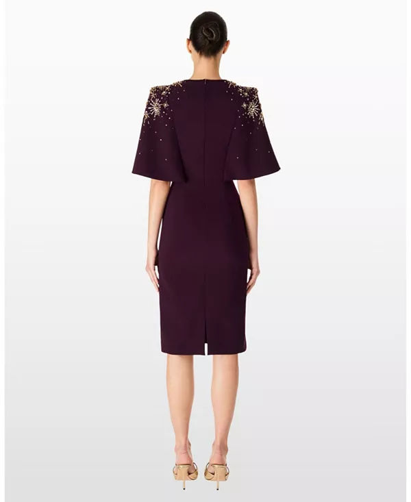 Бренд: Jenny Packham Цвет: фиолетовый Привлеките всеобщее внимание в этом платье из насыщенного фиолетового мускатного цвета, представляющем собой изысканное сочетание смелой структуры и нежной отделки. Приталенный силуэт подчеркивает фигуру, а эффектные рукава-кейп добавляют нотку утонченности. Украшенное замысловатой, сверкающей вышивкой бисером на плечах, это платье излучает ощущение высокой роскоши. Идеально подходящее для коктейльных вечеринок, торжественных мероприятий или особых торжеств, это платье предлагает современное прочтение вневременной элегантности.